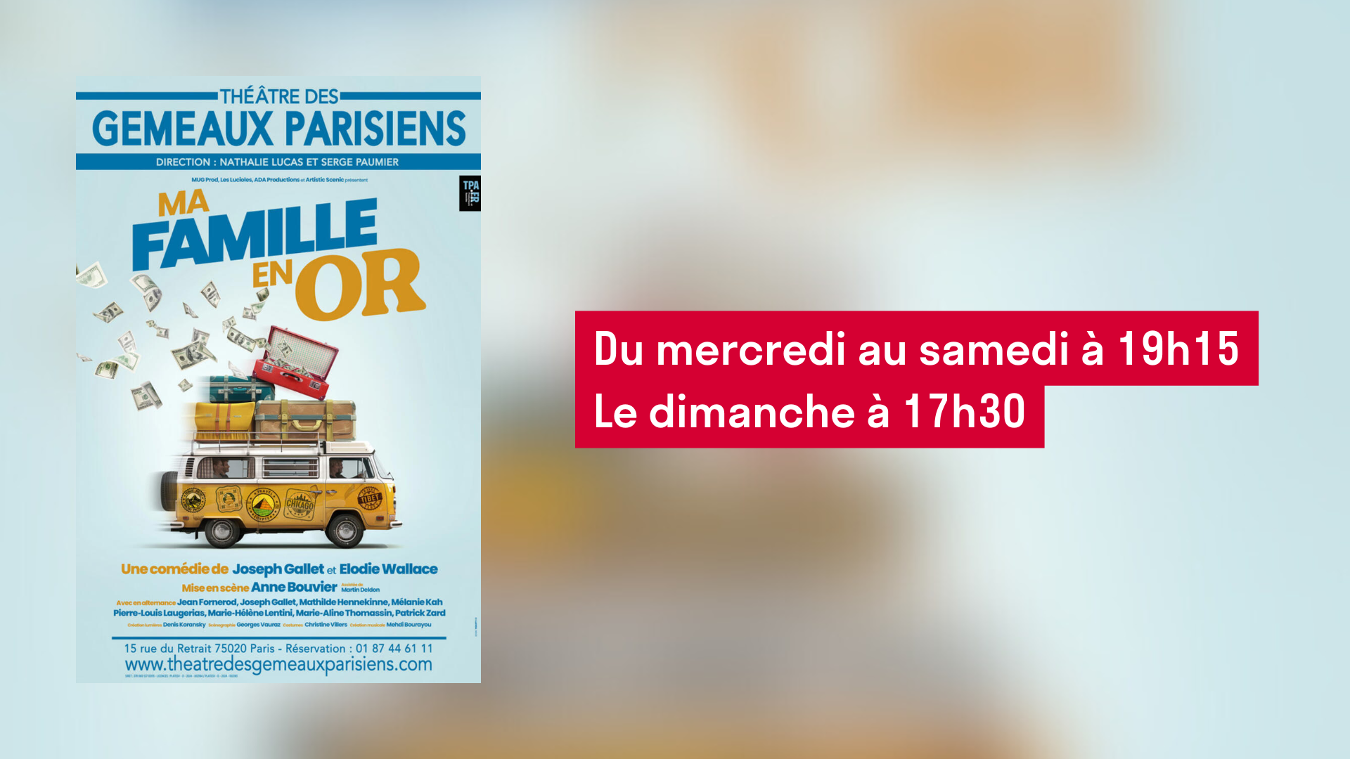 Signée Joseph GALLET (co-auteur du succès « Diner de Famille ») et Élodie WALLACE (lauréate du Molière du Meilleur Seul-en-Scène 2023), « Ma famille en or » mélange avec finesse humour, émotion et réflexions sur les liens familiaux. Embarquez avec nous pour un voyage en or.