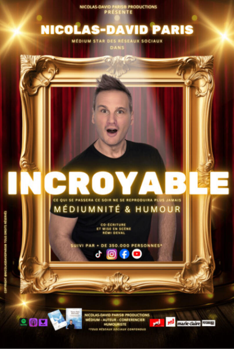 Si vous pensez avoir déjà vu ce genre de spectacle… vous allez comprendre, très vite, que ce n’est pas le cas. Il y a des humoristes. Il y a des médiums. Mais un spectacle qui mêle les deux, en faisant rire puis bascule dans de vraies captations médiumniques sur le public, en direct, sans complice, sans filet… ça n’existait pas. Dans INCROYABLE, Nicolas-David Paris démonte les clichés, caricature sans concession, raconte sa vie de médium avec un humour brûlant et soudain, l’invisible entre en scène. Des messages surgissent pour des spectateurs tirés au hasard. La salle retient son souffle. Chaque représentation est différente, car le public change tout. On vient par curiosité, pour “voir”. On repart en disant : “Il faut que tu y ailles. Tu ne vas pas croire ce que j’ai vécu.” Ce n’est pas qu’un spectacle, c’est une expérience qu’on vit, maintenant ou jamais… car ce qui arrivera ce soir n’arrivera plus jamais !