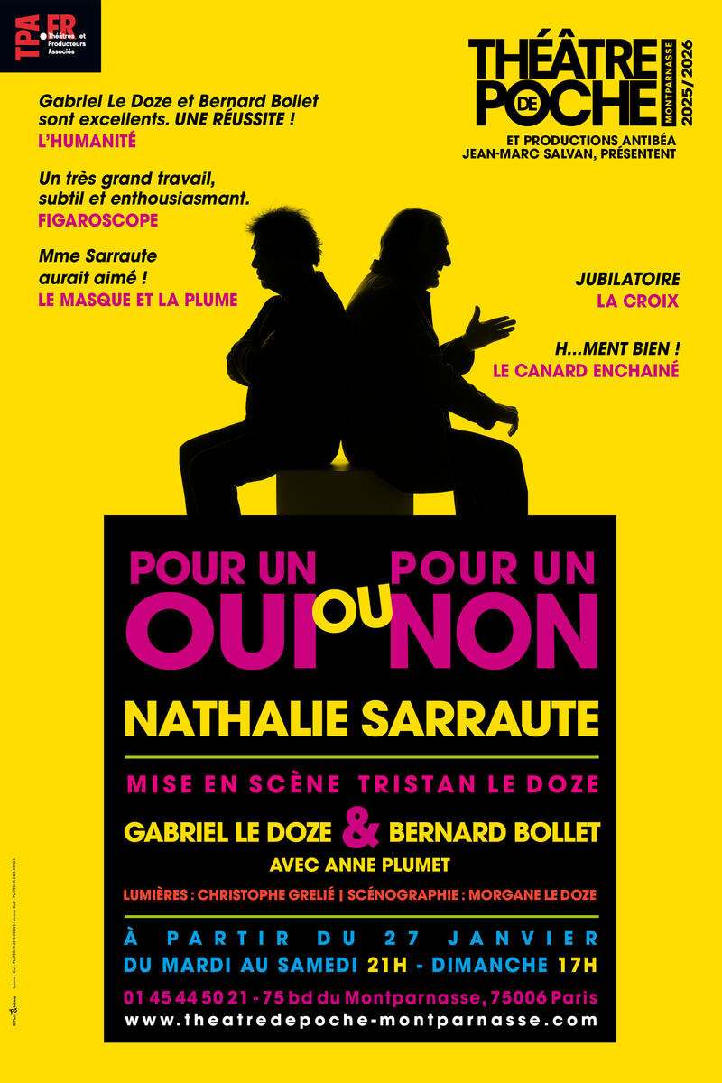 Pour un Oui ou pour un Non, en effet... c’est souvent d’un rien que partent brouilles et guerres. Nathalie Sarraute démonte sous nos yeux le mécanisme de déconstruction d’une vieille amitié, à partir d’une simple réplique devenue culte : « C’est bien…ça ! ». Le langage devient une arme insidieuse, creusant le fossé d’une rupture absurde, dont nous devenons les témoins privilégiés. Une petite tragédie du quotidien que le théâtre transforme en comédie jouissive !