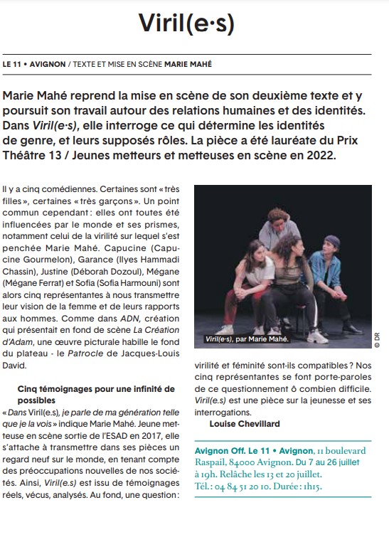 VIRIL(E.S) c’est le récit de Capucine, Garance, Justine, Mégane et Sofia qui ne correspondent pas à l’image mythique de la femme. C’est l’histoire de la grâce et de la vulgarité, de la gêne et de l’insolence, de la victoire et de l’échec. VIRIL(E.S) c’est surtout l’histoire de cinq filles biens qui se posent des questions.